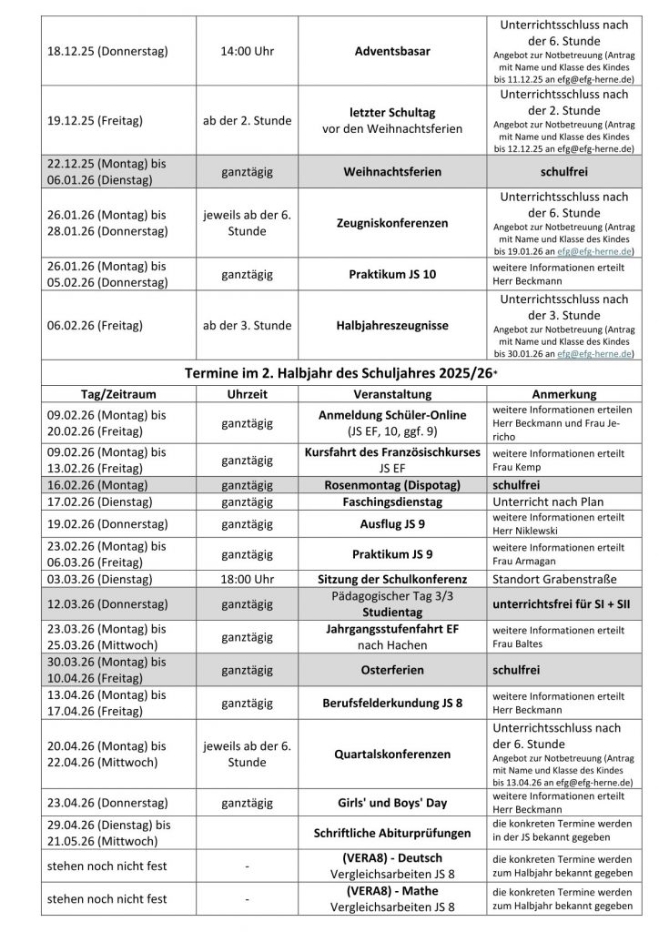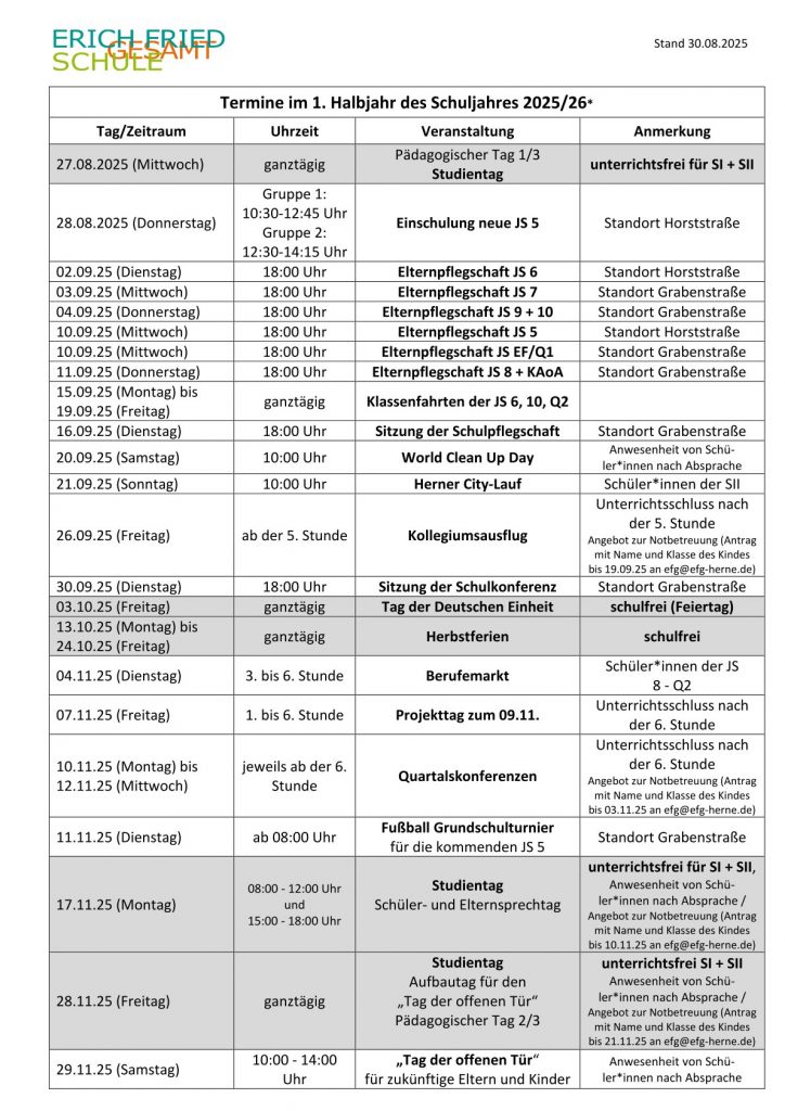 Wie immer zu Beginn eines Schuljahres vorab die wichtigsten Termine. Es wird sicherlich noch Änderungen geben. Bitte beachten Sie dazu auch die Mitteilungen auf unserer Homepage.