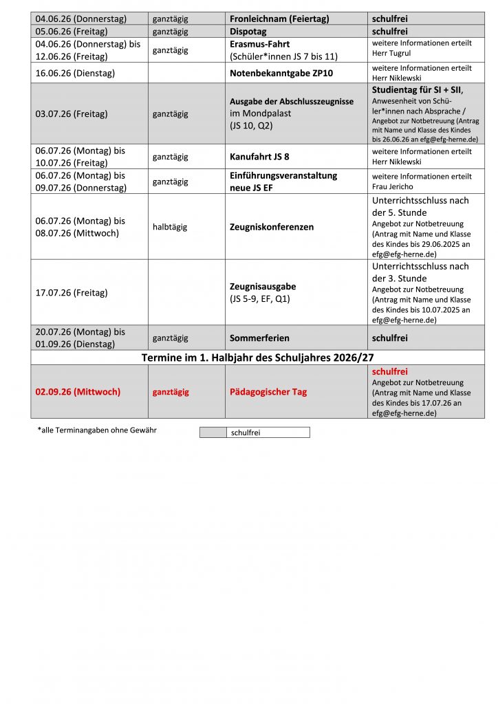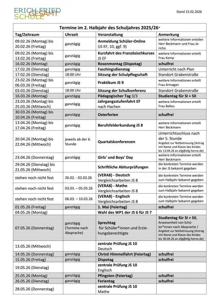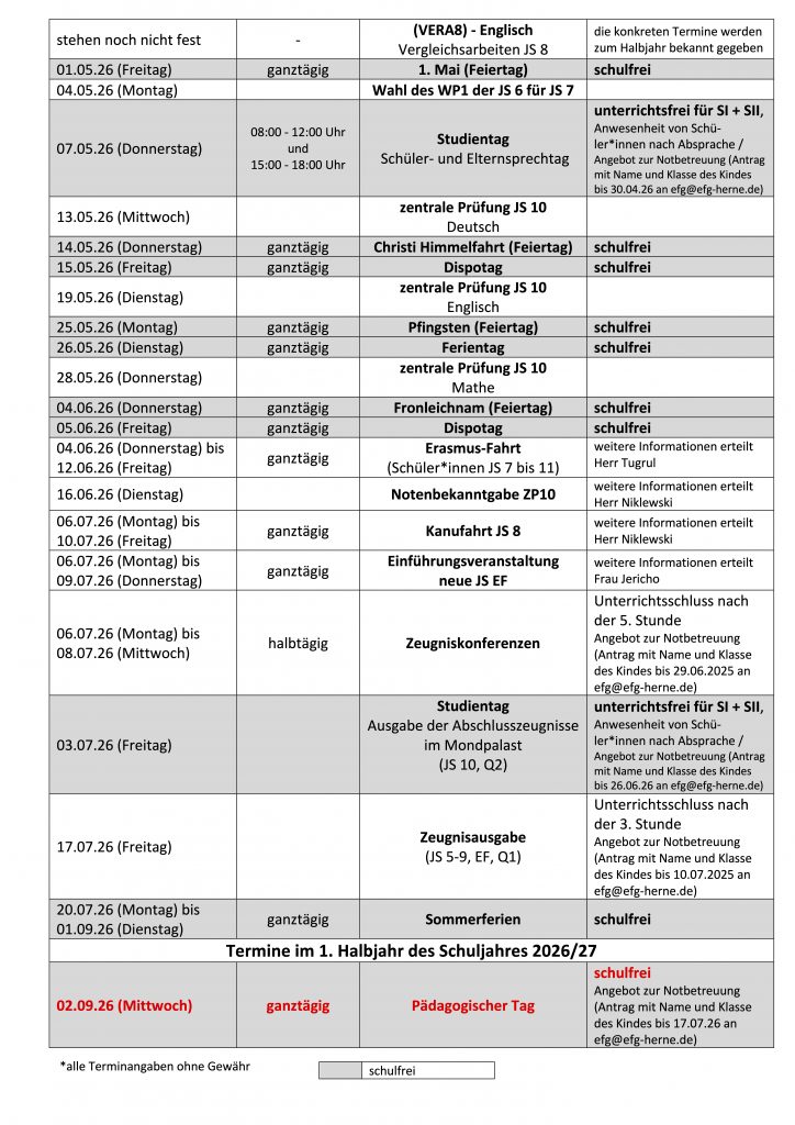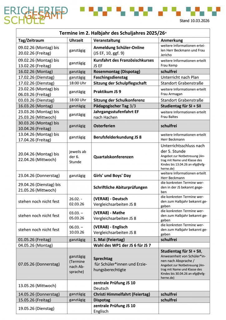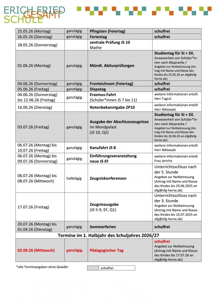 Änderungen der Terminübersicht (PDF Download) können jederzeit entstehen und werden über die Homepage und die Klassenlehrkräfte an die Erziehungsberechtigten weitergegeben.