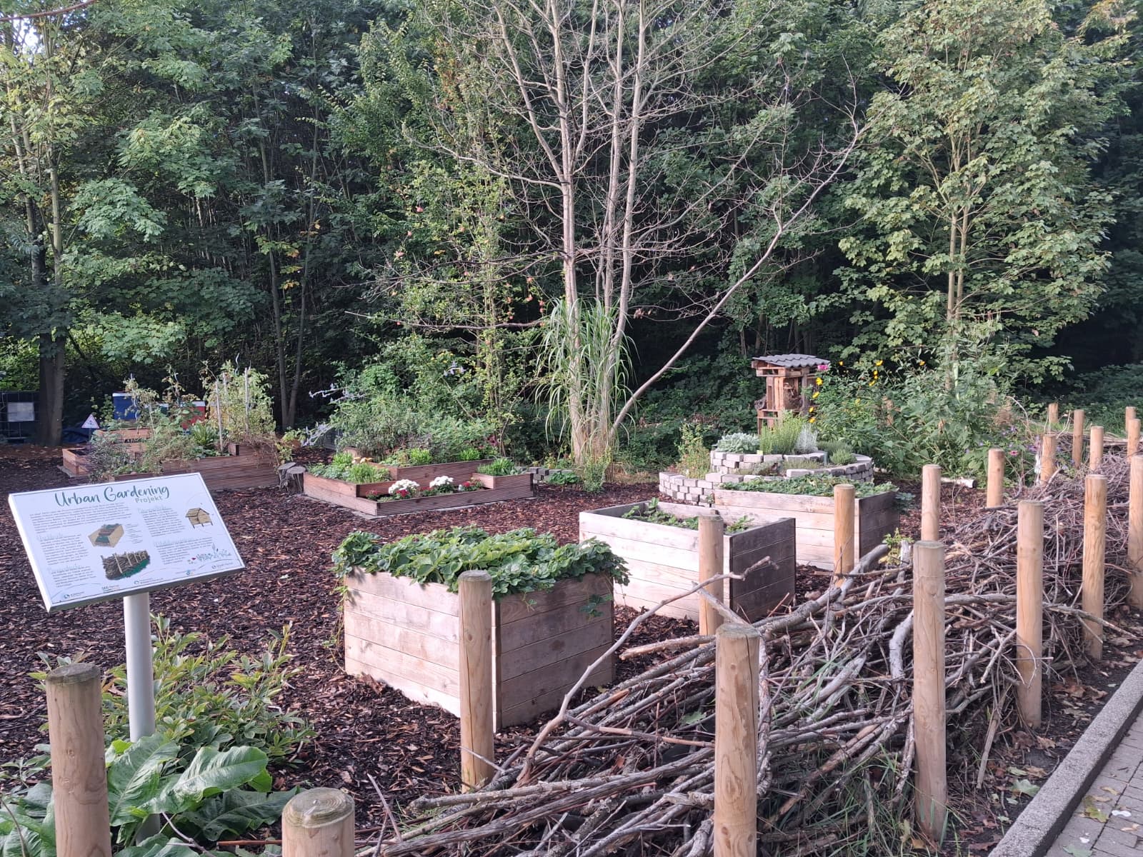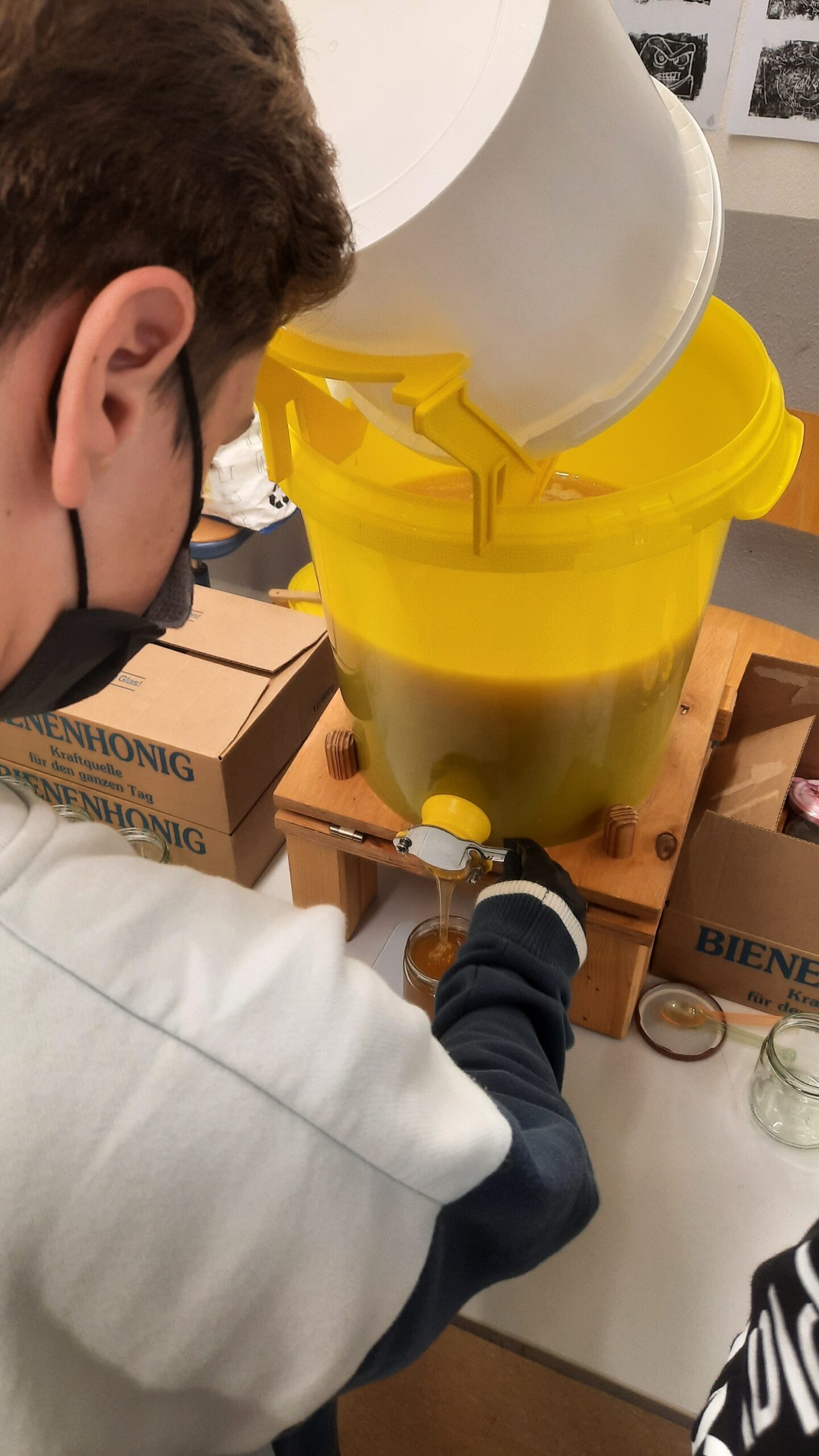 Aktuell arbeiten immer wieder unterschiedliche Lerngruppen auf der Fläche mit. So zum Beispiel die Kunstkurse von Frau Blumenkemper, der NW-Kurs von Frau Benimana und die AG von Frau Blase, die Unkraut bekämpfen, Hochbeete befüllen, den Zaun mit Totholz füllen, die Kräuterspirale gebaut und den Honig geschleudert und abgefüllt haben.